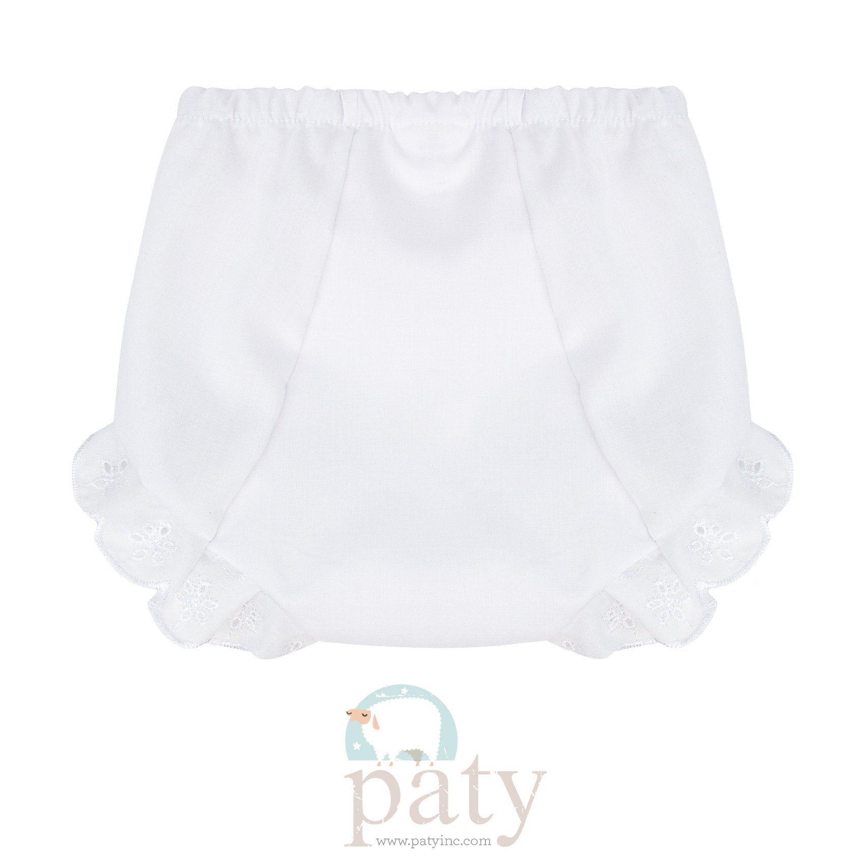 Diaper cover with beautiful white eyelet trim detail. Perfect for monogramming!